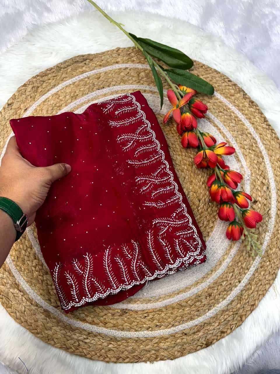 RC Red Fandy satin silk Saree